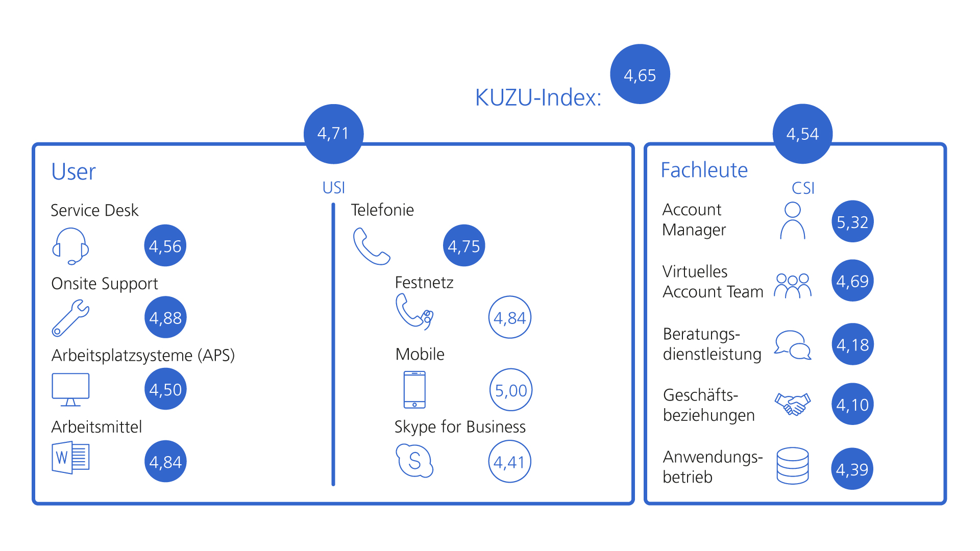 Die Kundenzufriedenheitsumfrage (KUZU) findet jährlich zwischen August und September statt. Das BIT schreibt über 3000 Benutzerinnen und Benutzer aus den Kundenämtern an, die ihre Büroautomation beim BIT beziehen. Die Teilnehmenden werden durch eine repräsentative Zufallsstichprobe ermittelt. Bei den Fachleuten findet hingegen eine Vollerhebung statt. Das BIT schreibt alle Integrationsmanager/-innen und Projektauftraggeber/-innen an. Bei der Berechnung des KUZU-Index gewichtet das BIT die Bewertungen der Benutzer und Fachleute 2:1.