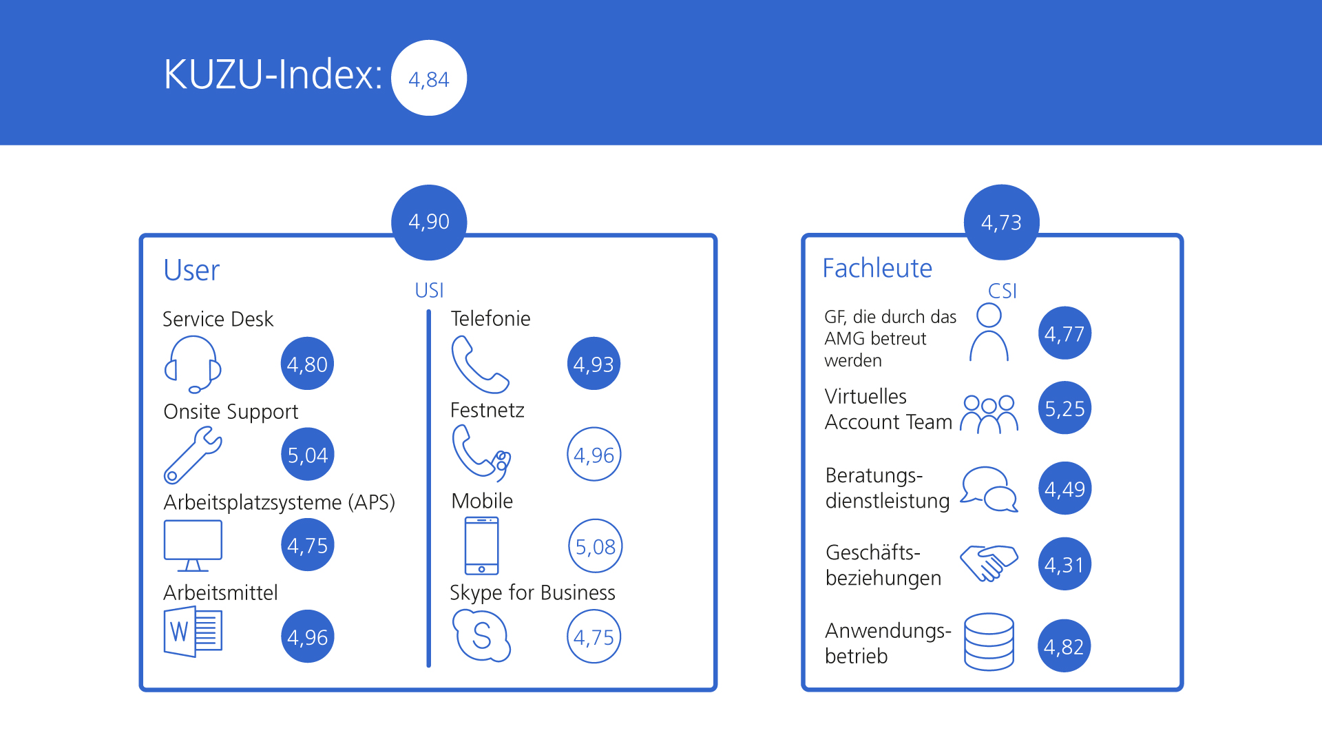 Jeweils Ende August und Anfang September führt das BIT seine jährliche Kundenzufriedenheitsumfrage (KUZU) durch. Das BIT schreibt über 3000 Anwender/-innen aus den Kundenämtern an, die ihre Büroautomation beim BIT beziehen. Die Teilnehmenden werden durch eine repräsentative Zufallsstichprobe ermittelt. Bei den Fachleuten findet eine Vollerhebung statt – das BIT schreibt alle Integrationsmanager/-innen und Projektauftraggebenden an. Bei der Berechnung des KUZU-Index gewichtet das BIT die Bewertungen der User und Fachleute im Verhältnis 2:1.
