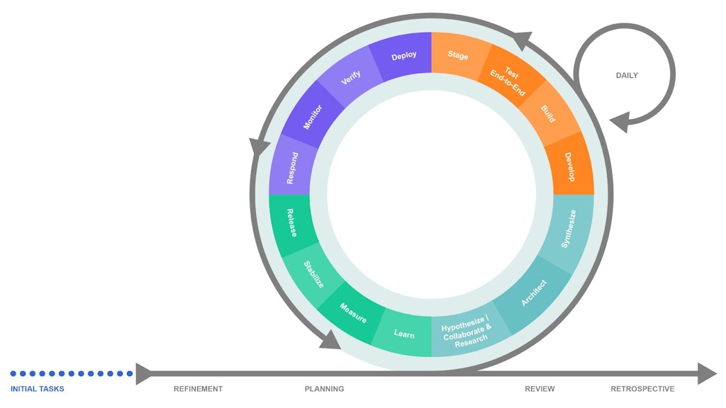 Der Hauptteil des PDC bildet der farbige Kreis, welcher die vier folgenden DevOps-Phasen enthält:
