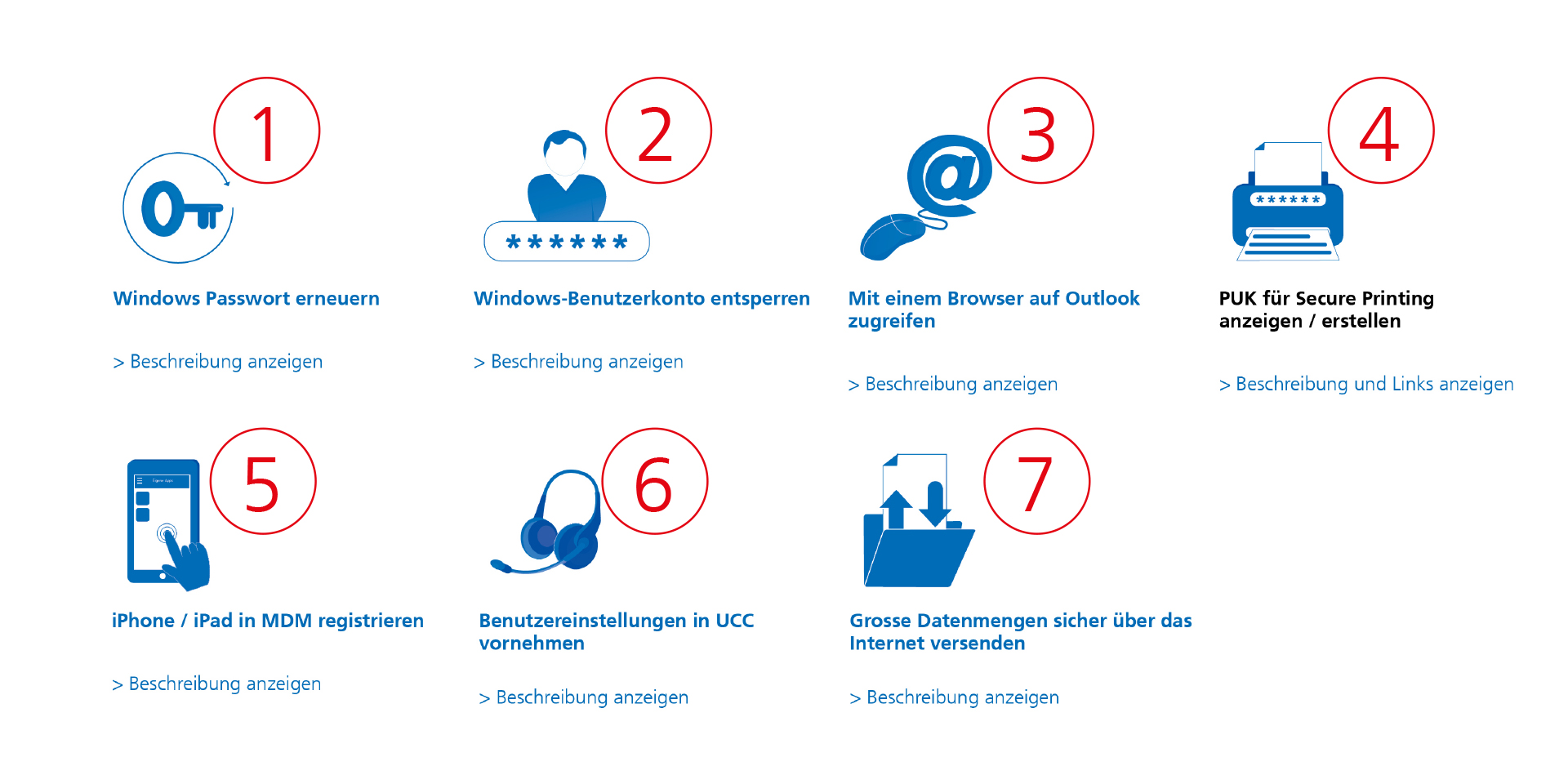Etwa bei den verschiedenen Self-Service-Angeboten, mit denen Sie selber Einstellungen vornehmen können. In der folgenden Grafik sind die einzelnen Anwendungen kurz erklärt.