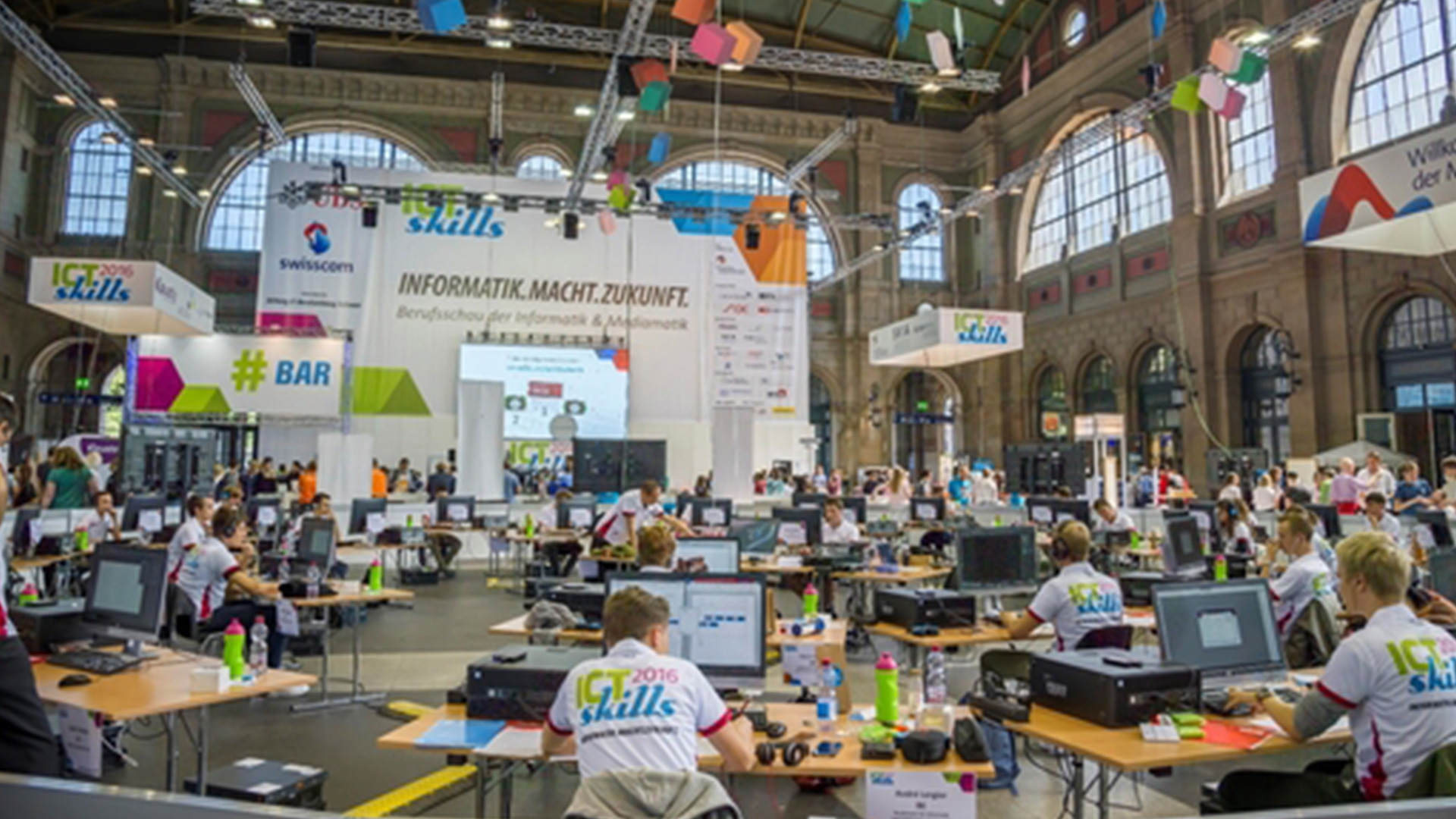 Les ICTskills 2015 se sont déroulés cette année du 8 au 10 septembre dans la gare de Zurich. Une zone a été installée pour les épreuves au milieu du hall de la gare.