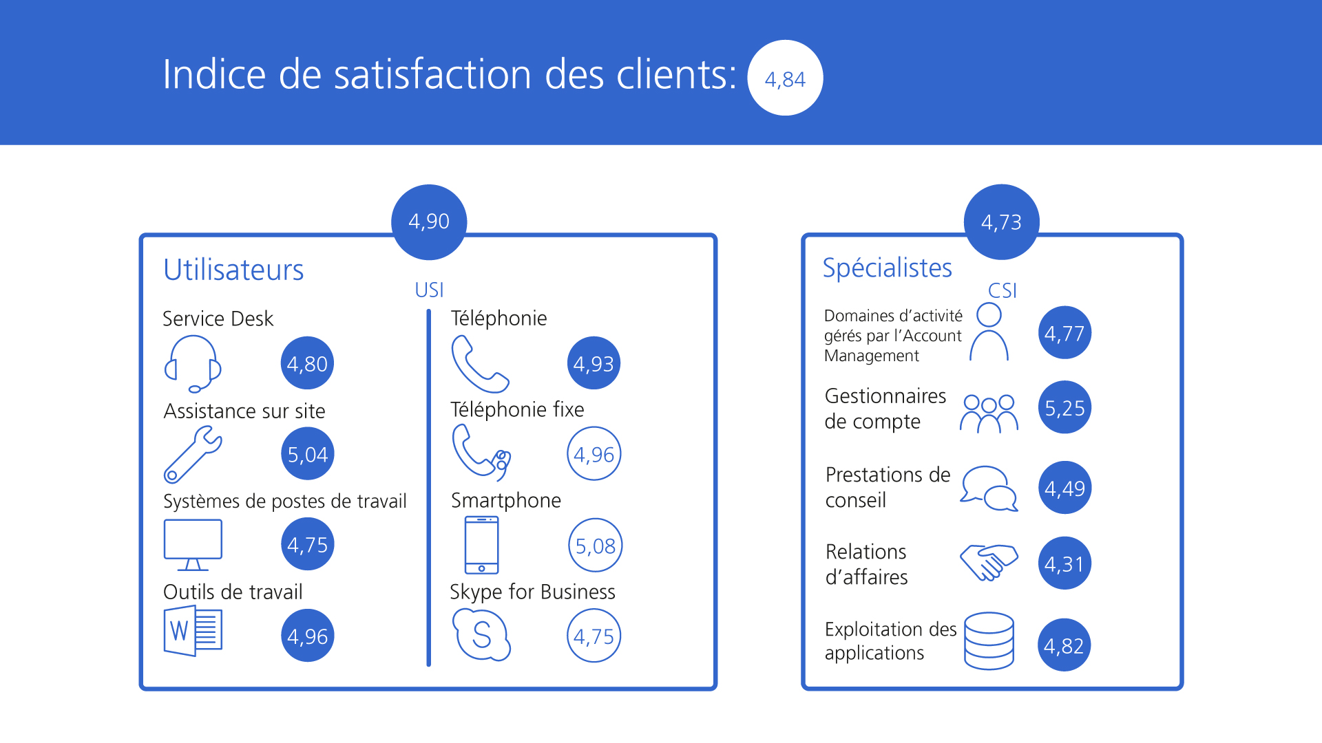 Pour Jakob Germann, responsable de la division principale «Domestic Services» de l’OFIT, «Les utilisateurs ont pour principal interlocuteur notre service d’assistance. Leur expérience à cet égard a un effet primordial sur leur satisfaction par rapport à nos prestations et à l’OFIT en général». C’est ce que confirment les notes, elles aussi les meilleures, attribuées aux systèmes de place de travail (ordinateurs de bureau, ordinateurs portables, tablettes, etc.: 4,75 points, soit + 0,25), aux outils de travail (produits MS Office: 4,96 points, soit + 0,12) et à la téléphonie (téléphonie fixe, mobile ou par ordinateur: 4,93 points, soit + 0,18).