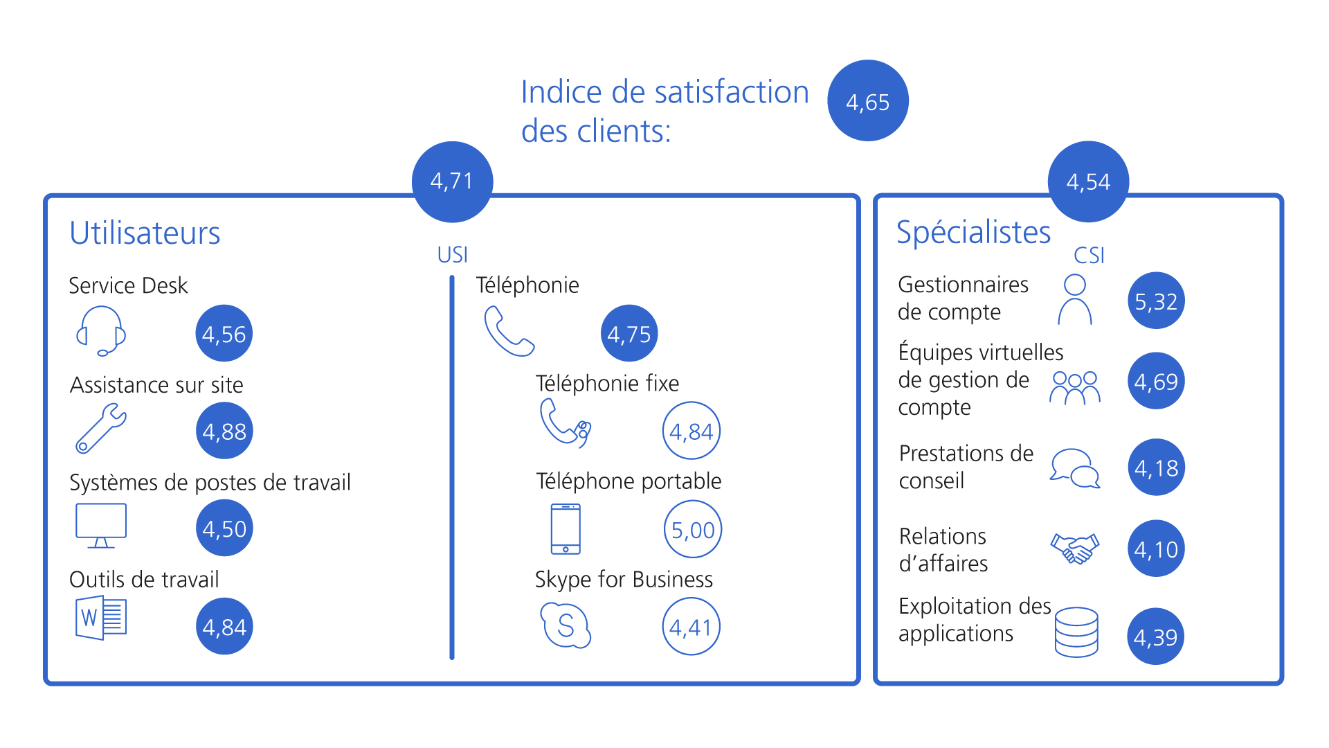 *Par utilisateurs, l’OFIT entend les personnes qui utilisent les systèmes informatiques de l’office (ordinateurs portables, téléphonie, logiciels, etc.) pour leurs tâches quotidiennes. Dans le cadre de l’enquête sur la satisfaction des clients, le groupe des spécialistes comprend, d’une part, les gestionnaires d’intégration des offices clients et, d’autre part, les mandants de projets qui ont achevé un projet avec l’OFIT durant la période couverte par l’enquête.