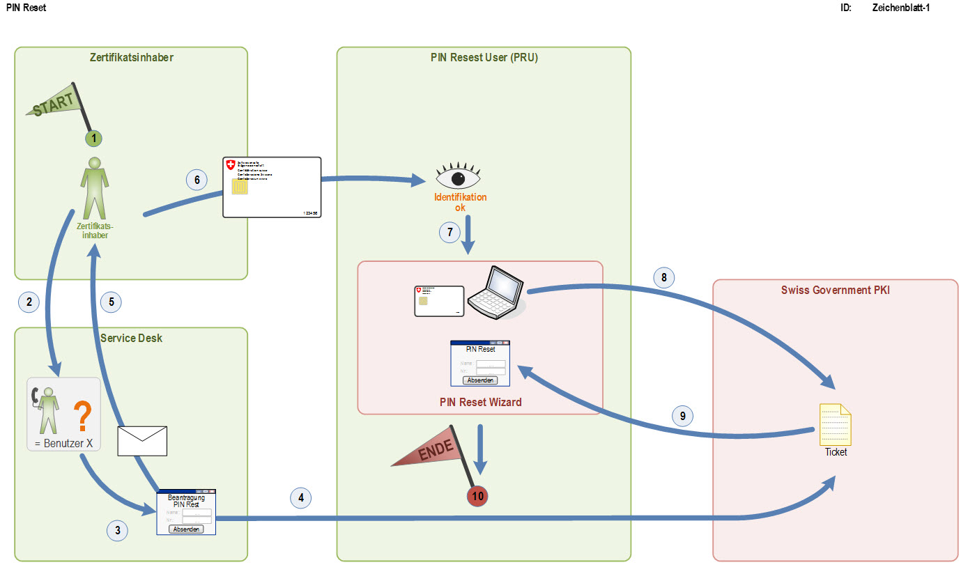 In questa postazione occorre che un utente sia registrato quale PIN Reset User (PRU) e che possa agire come tale. A questo punto viene avviato il PIN Reset Wizard e l’utente si registra con il suo certificato di classe B valido. Dopodiché il titolare del certificato/l’utente finale inserisce la sua smartcard bloccata nel lettore di carte disponibile. Il PIN Reset Wizard legge il numero di serie della smartcard e ricerca un ticket con questa sequenza numerica nel sistema centrale PKI.
