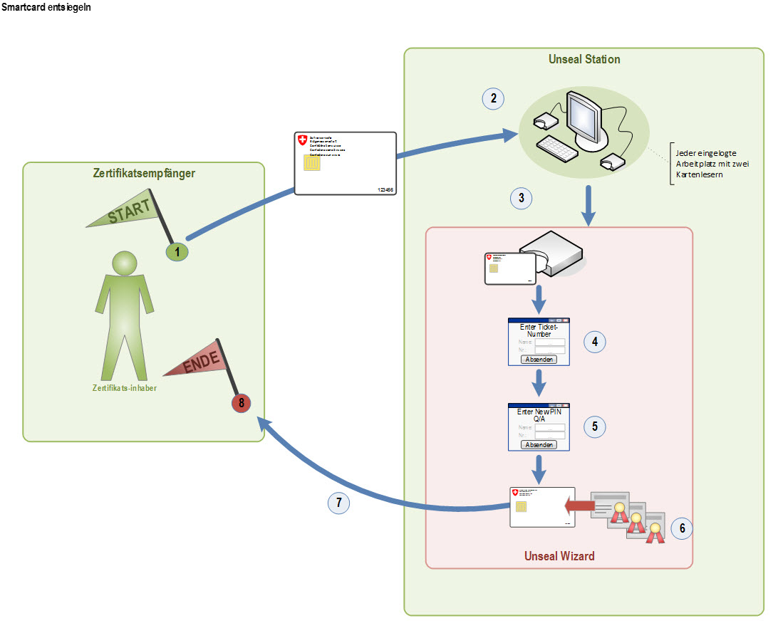 Il destinatario del certificato, dopo aver ricevuto sia la smartcard personale (prestaged) che il documento «unseal» nel processo del RIO, può sbloccare la sua smartcard (rimuovere i sigilli). A tale scopo, il destinatario del certificato deve trovare una postazione di lavoro provvista di due lettori di carte, nella quale sia già registrato.
